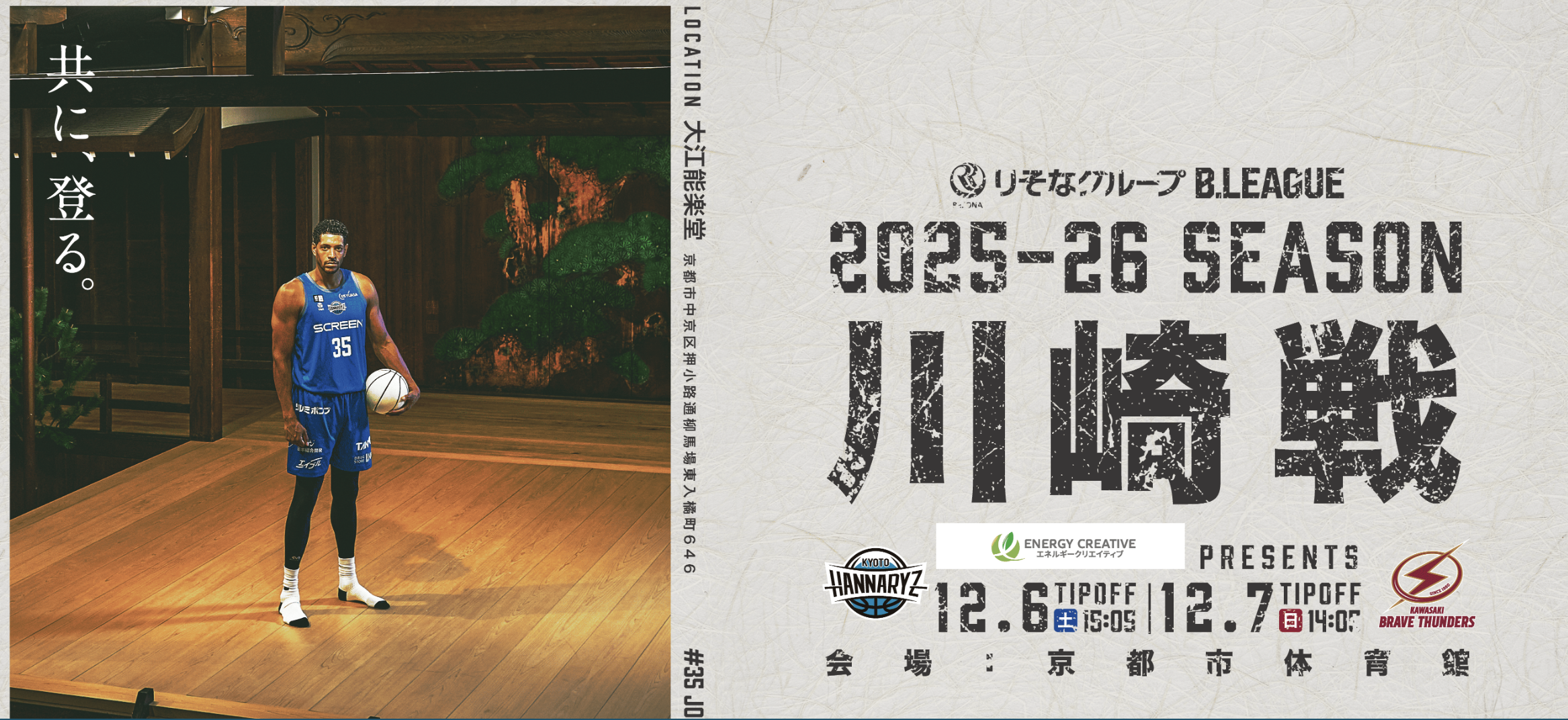 2025年12月6日(土)・7日(日)、かたおかアリーナ京都市体育館にて開催されるB.LEAGUE公式戦「京都ハンナリーズ VS 川崎ブレイブサンダース」において、「エネルギークリエイティブ株式会社 スポンサーDAY」を実施いたします。